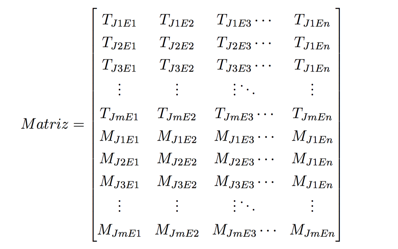 a matriz de dados é subdividida em tempos (TJmEn) e maquinas (MJmEn). Onde T representa o tempo da operação, J o job, E a etapa do roteiro. Essa configuração permite uma interpretação compacta do roteiro